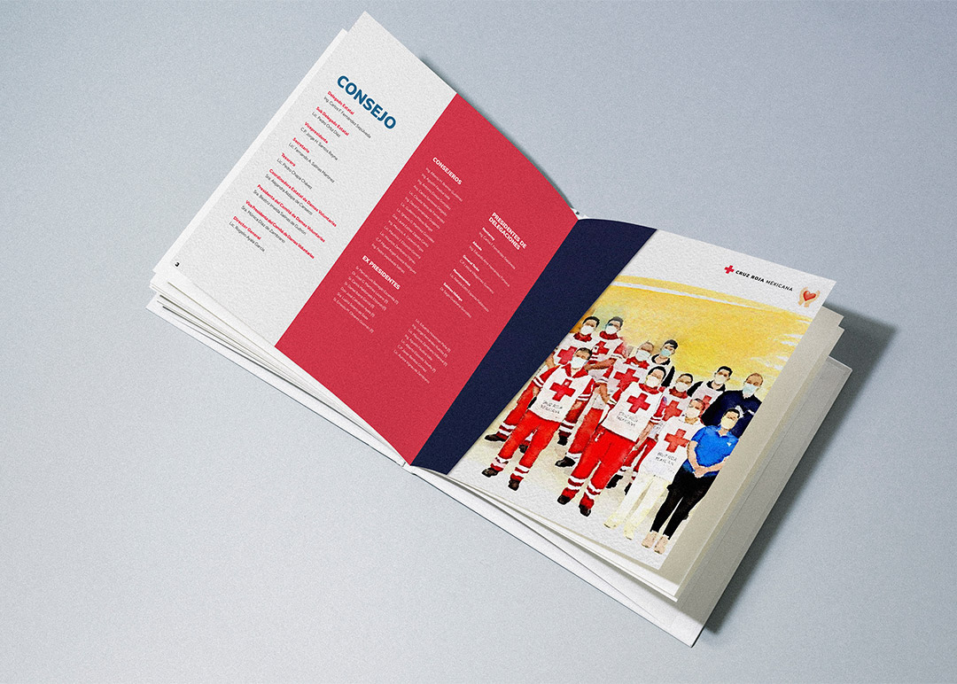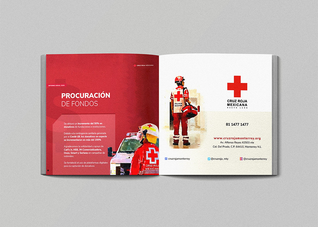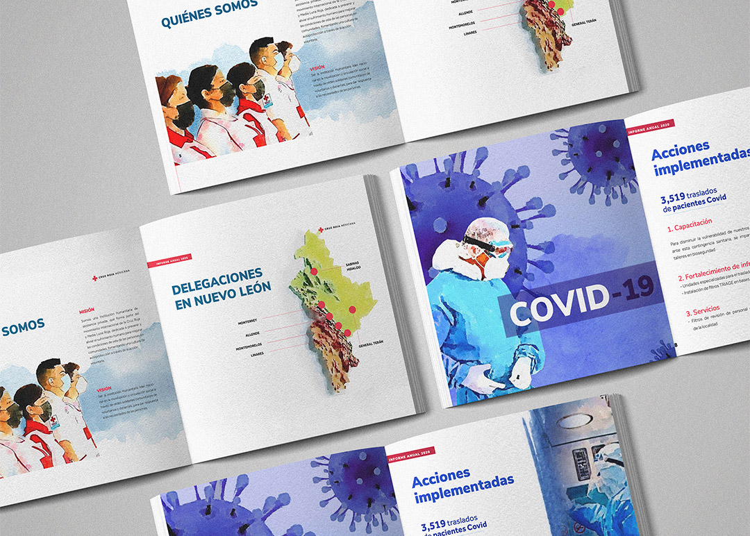 Maquetación del Informe anual de Cruz Roja Monterrey 2020. Creación de ilustraciones basadas en fotografías reales.